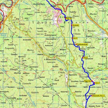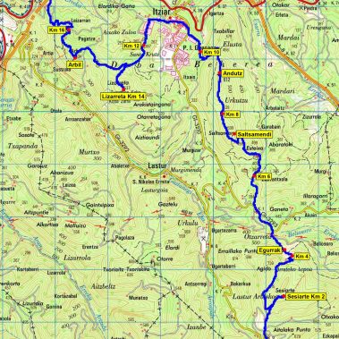 Descenderemos por buen sendero señalizado hasta el collado de Txapasta (332 m) y desde aquí en poco tiempo alcanzaremos el pueblo de Itziar (224 m). Caminaremos por él hasta llegar al popular santuario construido, según cuenta la leyenda en una única noche, por los gentiles en el paraje llamado Zabaleta. De aquí saldremos al camposanto por pista hormigonada. Una senda nos conducirá a la carretera que lleva a unos pabellones industriales. Al final del asfalto iniciaremos el camino, que rodeando el mogote de Santikurutz (384 m), nos depositará en el pequeño collado Artutzaran o Artutzun (411 m), con una borda y una cruz de señales. Una de las señalizaciones nos marcará inconfundible la dirección de la cumbre, con maleza y lapiaz que sube SW y luego SE hasta la cima del Lizarreta (537 m), con buzón y señal geodésica.