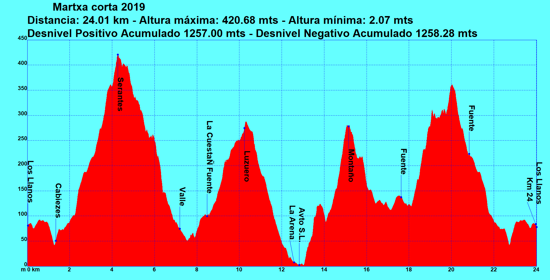 El recorrido de la marcha corta tiene 24 kilómetros y el desnivel positivo de 1.257 metros, lo mismo que el desnivel negativo acumulado.
