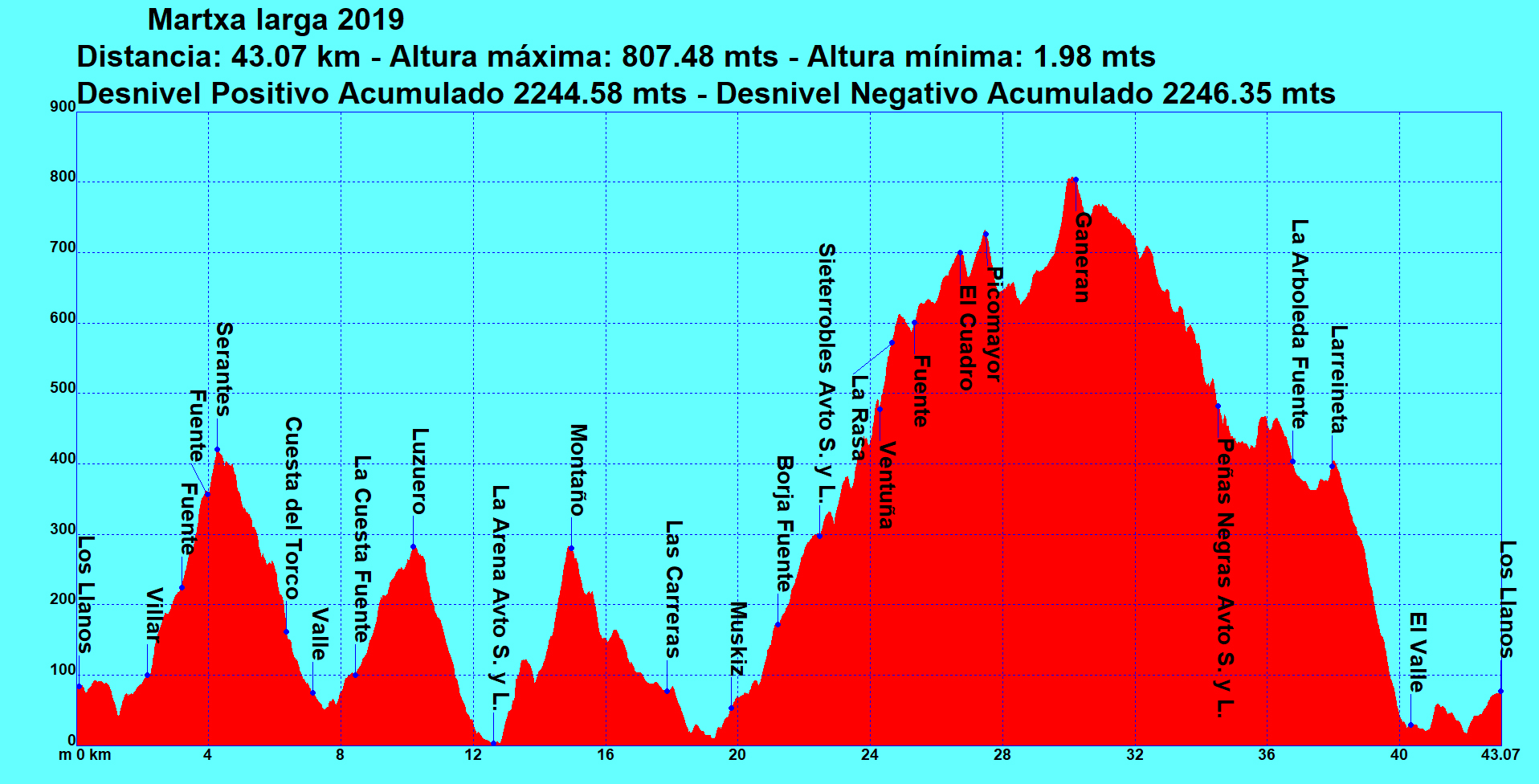 El recorrido de la marcha larga tiene 43 kilómetros y el desnivel positivo acumulado es de 2.244 metros, lo mismo que el desnivel negativo acumulado.