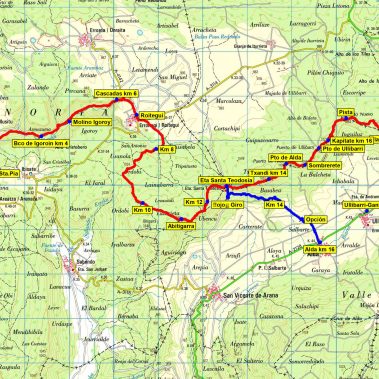 Seguiremos caminando por la alambrada hasta llegar a los alrededores de la antena, en el lugar de Eskibela. Dejaremos la alambrada y seguiremos un difuso camino entre el Hayedo siguiendo los Cairn que nos van indicando el camino a seguir. Dejaremos a la derecha un conjunto de bellos bloques rocosos desprendidos, destacando la gran cicatriz de Karalabia. Así llegaremos a una barrera y al asfalto que pasando por el camposanto nos dejará en Kontrasta (825 m) lugar donde nos esperará el bus