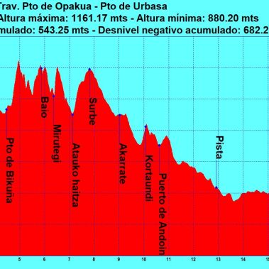 Continuaremos el recorrido caminando por toda la cresta hasta alcanzar la cima del Mirutegi (1.167 m) coronada por una cruz. Proseguiremos hasta el Atauko Haitza (1.103 m), placa. Seguido alcanzaremos las cimas del Surbe (1.157 m), Buzón, Akarrate (1.089 m), placa en mugarri y Kortaundi (1.069 m), antes de llegar al Puerto de Andoin.
