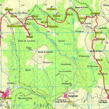 Regresamos hacia la ermita para girar al E y, tras pasar el desvío que baja por la opción del barranco Baltsaberri hasta Arguiñano, avanzar por el Zurloz (1.224 m) y el Tanturaundi (1.132 m). Más adelante afrontamos las dos cotas del Zoiolagaina, siendo la 2ª más alta (1.147 m), con placa-buzón.