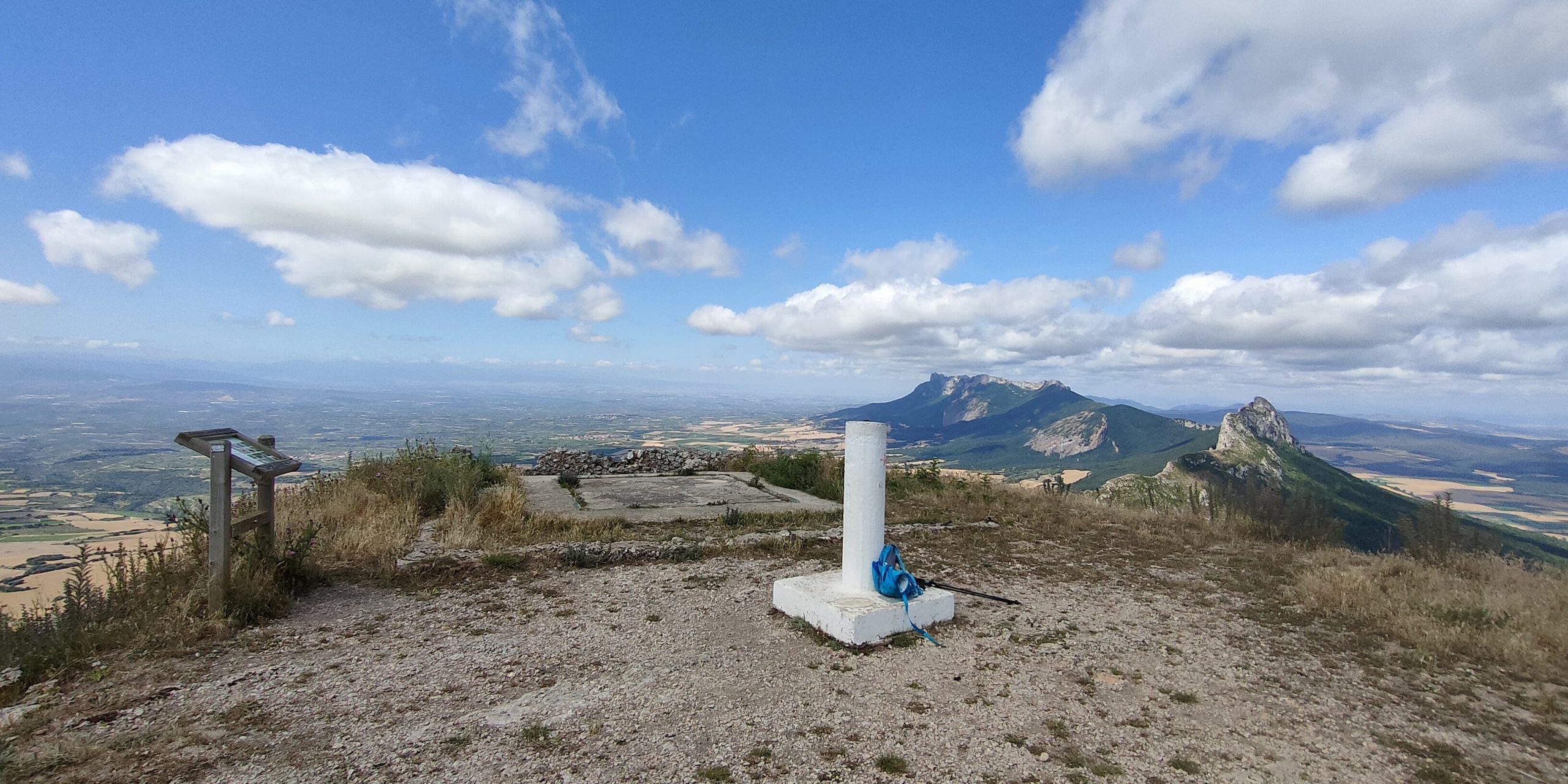 Una vez superado este tramo conectamos con el que va a ser el camino de bajada y desde donde ya vemos la maravilla de entorno. Giraremos unos metros a la derecha hasta llegar en continúa subida a la amplia meseta donde se sitúa la cima. Prácticamente es indescriptible todo lo que podemos observar en la cima de Castillo de Lapoblación (1.244m). Vértice Geodésico, las ruinas del castillo y un buzón con un hacha.