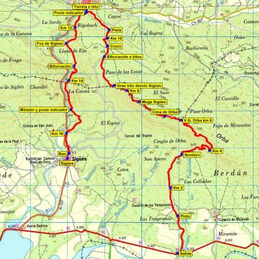 Comenzaremos el descenso siguiendo por el cordal donde algunos cairns nos ayudarán a seguir el trazado, el cual se mantiene siempre no demasiado alejado del borde, desde donde disfrutaremos de panorámicas ocasionales. Al poco tiempo alcanzaremos un hito de piedras de considerable tamaño que señaliza el desvío a la localidad de Sigües. Más abajo penetraremos en un bosque mixto de marojos y pinos que nos dejarán en una pista. Continuaremos por ella en dirección norte hasta encontrar unos hitos a la izquierda, que por una senda nos introducirá en un terreno de matorral que, en ocasiones, el trazado no es muy evidente.