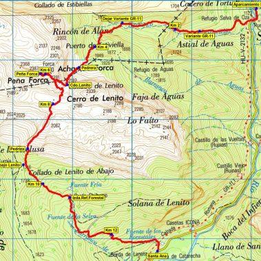 Un camino atraviesa el bosque hasta el collado inferior de Lenito o Collado de Lenito de Abajo (1.716 m). Hacia el N. se ataca la montaña por terreno inicialmente herboso y luego, realizando un pequeño quiebro de un resalte calizo, por la izquierda, nos elevamos a lo alto de una redondeada loma herbosa. A través de una pequeña cresta que discurre a caballo entre dos grandes extensiones de lapiaz se gana otra cota secundaria (2.159 m) sobre un pequeño valle suspendido al pie de las cumbres de Penyaforca y Lenito. Tras un breve descenso, se gana el collado de Lenito (2.197 m), y de aquí a la cima del Penyaforca