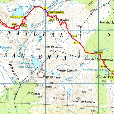 Pasaremos al lado del refugio Riopedro para en breve llegar a un puente que nos cruzará el río Tera. Nuestro camino surcará el amplio valle hacia la mole de Peña Trevinca, ya visible. Nos puede tocar un terreno muy encharcado y con mucha agua, que nos puede obligar a cruzar varios arroyos saltando.