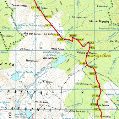 Arranca la subida por un camino bastante empedrado que nos llevará a una loma cruce de caminos con la ruta que nos llevaría al refugio de la Laguna de las Yeguas. Comenzará un descenso para bajar al valle que cruzará el río Tera. Por el camino dejaremos una fuente (en verano posiblemente seca), y el cruce del arroyo Riopedro.