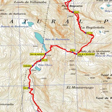 Punto de Partida: Puente de Literola (1580 m) pasado el cruce a Baños de Benasque. Tomaremos un sendero que asciende muy rápidamente entre el bosque por la margen izquierda del barranco de Literola. La cuesta se va moderando y siempre por la misma margen alcanzaremos un pequeño collado (2000 m). Pasado éste, el camino llanea sin ganar altura hasta un cruce de barrancos donde se asienta un pequeño refugio de pastores. El camino entonces gira a nuestra derecha (Norte) y ayudándose de una serie de zigzags gana altura sobre el barranco de Literola. Rápidamente enderezamos hacia el NO sin abandonar la margen izquierda del barranco, aunque en algunas ocasiones nos acercamos casi hasta su cauce.