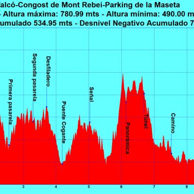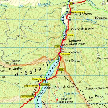 Desde el refugio de Montfalcó, a donde llegaremos en 4x 4, un sendero sale hacía el Congost, perfectamente señalizado en todo momento. Estos primeros tramos serán de constante bajada. Tras unos 600 m llegaremos a la fuente de Montfalcó, único punto de la ruta en el que dispondremos de agua potable. Aproximadamente a unos 2Km nos encontraremos con el primer tramo de pasarelas ancladas a la roca. El ascenso (muy vertical) por las pasarelas no es difícil, pero sí impresionante, con un paisaje espectacular.