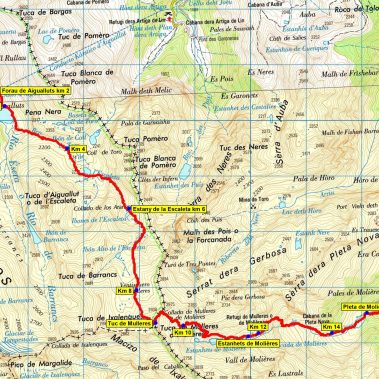 Superado el límite del arbolado se cruza el pantanoso Pla de Aiguamoll (1700 m) (0,30) y posteriormente la Ple¬ta Nova (2000 m) (1,15). Sigue una pronunciada ladera donde el torrente forma cascadas y la senda sube dando un rodeo. Al alcanzar la cubeta del primer lago aparece a la derecha (N), sobre un alto, el Refugio de Mulleres/Molières (2360) (2,15 m).
