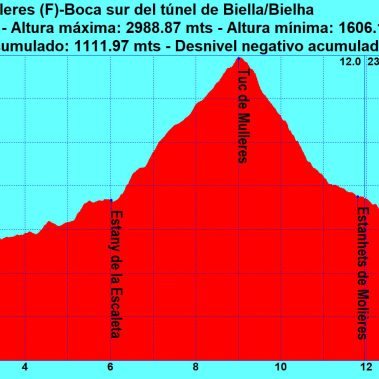 El valle es ahora ancho y suave, de vez en cuando aparece un ibón. Tras dejar a la izquierda (E) el Col de Aranesos giramos al sur dirigiéndonos al amplio collado abierto entre Mulleres (E) y Salenques (W). Remontando pedreras y ocasionalmente neve¬ros, indistintamente por la cresta norte o la occidental, se alcanza el Tuc Mulleres o Molières (3010 m) (F) (4,00). (1 hora menos desde Senarta)