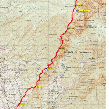 Salimos del aparcamiento del Mirador del Time cuesta arriba hasta alcanzar la Torre del Time, magnifico mirador. A partir de los 800 metros entramos en el territorio del pinar. Durante este camino pasamos varias veces junto al borde de enormes riscos. El pinar desaparece al llegar a los 2000 metros, en la zona conocida como Pinos Gachos.
