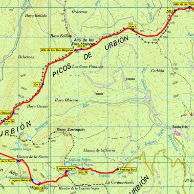 En el Puerto de Santa Inés (1.753 m) comenzaremos a caminar por una pista a nuestra derecha, que asciende rápidamente hasta llegar al alto de Tres Cruces (1.899 m). Una vez en el cordal continuaremos por él para ascender seguidamente al Alto de las Tres Mojoneras (1.885 m), lugar donde confluyen los términos de Vinuesa y las dos Viniegras riojanas, la de Arriba, y la de Abajo. Continuaremos caminando por un agradable sendero bien evidente, el cual nos conducirá a la base de la cima. En este tramo de la ruta, tendremos sucesivamente a nuestra izquierda, entre nosotros y el Picacho Zorraquín, la cubeta glaciar de la Hoya del Revinuesa, y a nuestra derecha el Hoyo Oscuro dentro del valle del río Urbión.