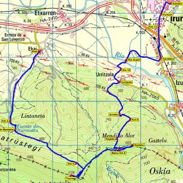 Descenderemos por el mismo camino hasta la Balsa y giraremos a la derecha para dirigirnos, primero por prados y después por bosque hasta el pueblo de Urritzola. A la salida del pueblo tomaremos una pista para cruzar por un puente el río Arakil y así llegar a la carretera que nos llevará hasta la localidad de Irurtzun, lugar donde estará aparcado el Bus.
